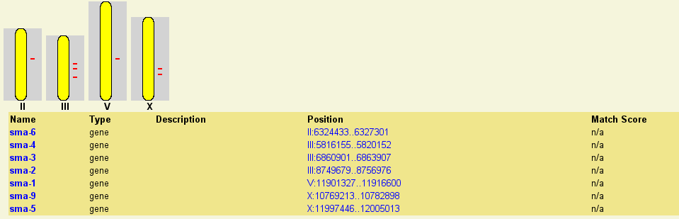 If more than one landmark or keyword search is found, then the browser will display a graphical representation of the whole genome and summarize the various hits in a table. You can click on one of the landmarks in either the graphical display or the table in order to view it in the detail view: