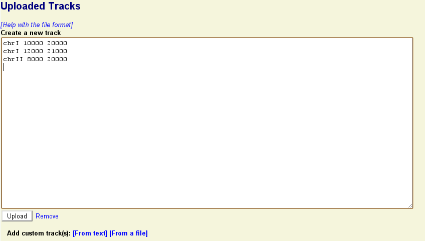 For anything more than a short list of annotations, you will want to prepare your custom track(s) in a file on your local machine and upload the file to GBrowse. This is also mandatory for file formats that require fields to be separated by tabs rather than spaces. Use a text editor to prepare the track definitions and data and be sure to save as text only. Now click on the "From a file" link in the upload area, and follow the prompts to upload the file.